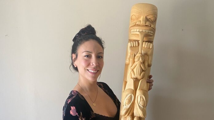 Morgan, who is of Nisga’a (House of Kw’isk’ayn), European, and Métis heritage, is a sculptor, painter, and designer. Her art mixes tradition with fresh ideas, something she’s been shaping since her days at the Freda Diesing School of Northwest Coast Art, where she learned from master carvers Dempsey Bob, Stan Bevan, and Ken McNeil.