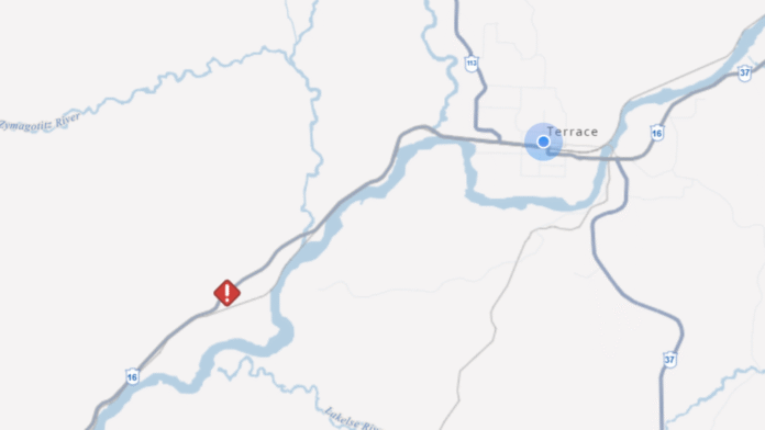 The slide was first reported around 7:30 a.m. in East Amsbury, about 10 kilometers west of the city. Rocks and debris covered the westbound lane, prompting an initial full closure between Terrace and Prince Rupert.