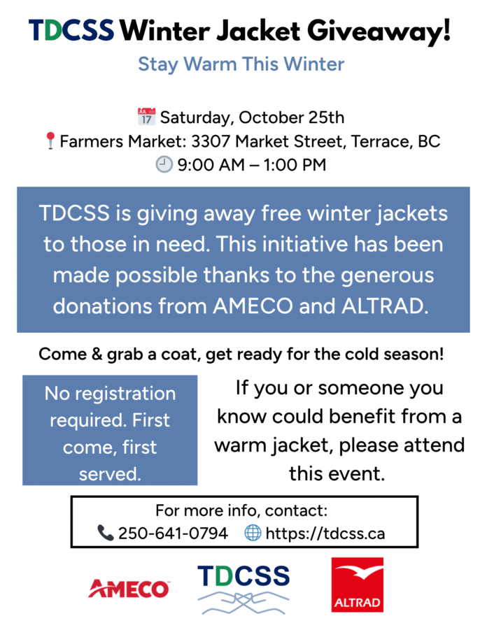Terrace & District Community Services Society is giving away free winter jackets to those in need. This initiative has been made possible thanks to the generous donations from AMECO and ALTRAD. There will be free refreshments served as well.